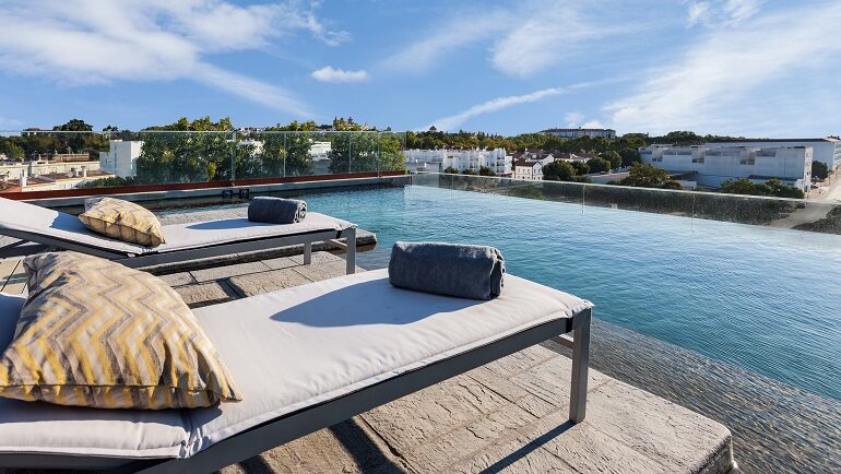 A piscina exterior panorâmica, situada no topo do edifício, presenteia-nos com uma vis¬ta fabulosa sobre a cidade e a planície.