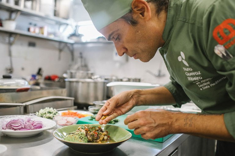 Com experiência em restaurantes de todo o mundo e uma grande paixão pela cozinha e pela vida, Nuno Queiroz Ribeiro foi o primeiro Chef português a ser reconhecido pelo Ministério da Saúde com uma Distinção de Mérito, pela defesa dos valores e sabores da alimentação consciente. Na mesma senda, em parceria com a Câmara Municipal de Lisboa, foi co-autor do 1.º projeto piloto nacional dedicado à alimentação saudável – o programa “Crescer Saudável” – através do qual se conseguiu “inserir produtos hortícolas nas refeições servidas em mais quase 1o00 escolas” da capital. Atualmente, além do seu restaurante Mediterra, é responsável pelo catering do Colégio Internacional Redbridge School onde desenvolve os menus escolares com base na Dieta Mediterrânica, promovendo a redução do consumo de proteína animal.