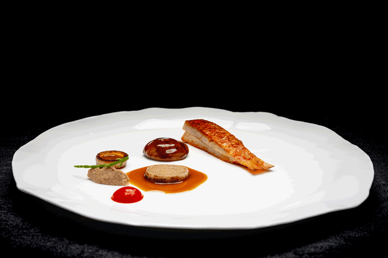 Salmonete de rocha assado, lulinhas à Algarvia e lagostim.
