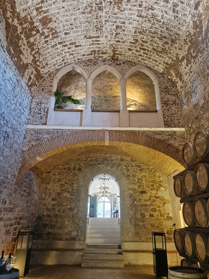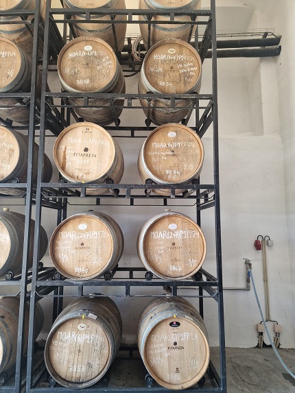 Hoje o Paço apresenta-se com toda a sua imponência e aqui se recebem as uvas apanhadas durante a noite, através de uma vindima manual, e que chegam ainda frescas. O processo arranca no início de agosto com as uvas brancas, que vão para um tapete onde são selecionadas, depois para as prensas pneumáticas e o sumo segue para as cubas, para decantar a frio entre sete a 12 horas. O objetivo, explica Alexandra, não era ter um museu, mas sim dar uma função ao “novo” Paço, o de ser a adega de brancos. Podemos conhecer, e saborear, vinhos como o Laranja Mecânica, o Fitapreta Branco, o Morgado de Oliveira, a Touriga Vai Nua ou o Chão dos Eremitas, este último proveniente de uma vinha velha de 50 anos, no sopé da Serra d’Ossa onde os Eremitas de São Paulo plantavam as suas vinhas. E experimentamos igualmente três tipos de fermentação: em inox, barrica ou talha.