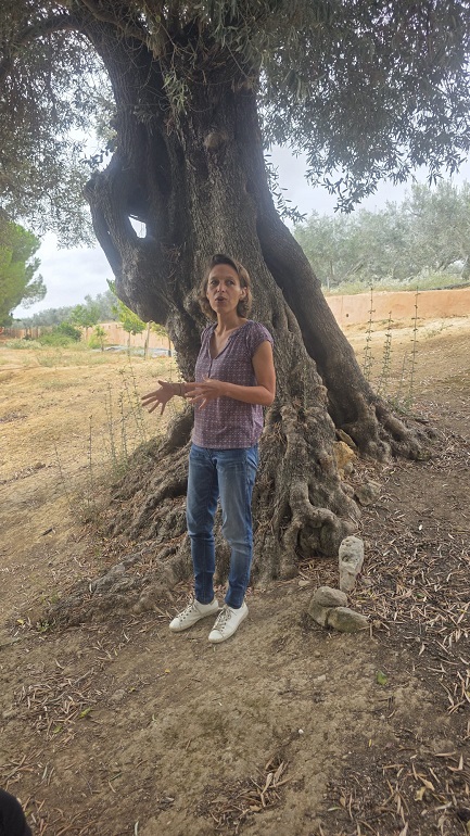 Quem nos recebe é Veronique, que nos conduz numa viagem de cerca de uma hora pelos olivais e lagar desta quinta. Uma viagem que começa precisamente por colocar o grupo de visitantes em redor da oliveira mais antiga desta propriedade: tem 500 anos e, garante a nossa guia, ainda dá azeitona. Um excelente ponto de partida para esta visita que nos leva pelo olival que veio substituir o que outrora foi um laranjal.
