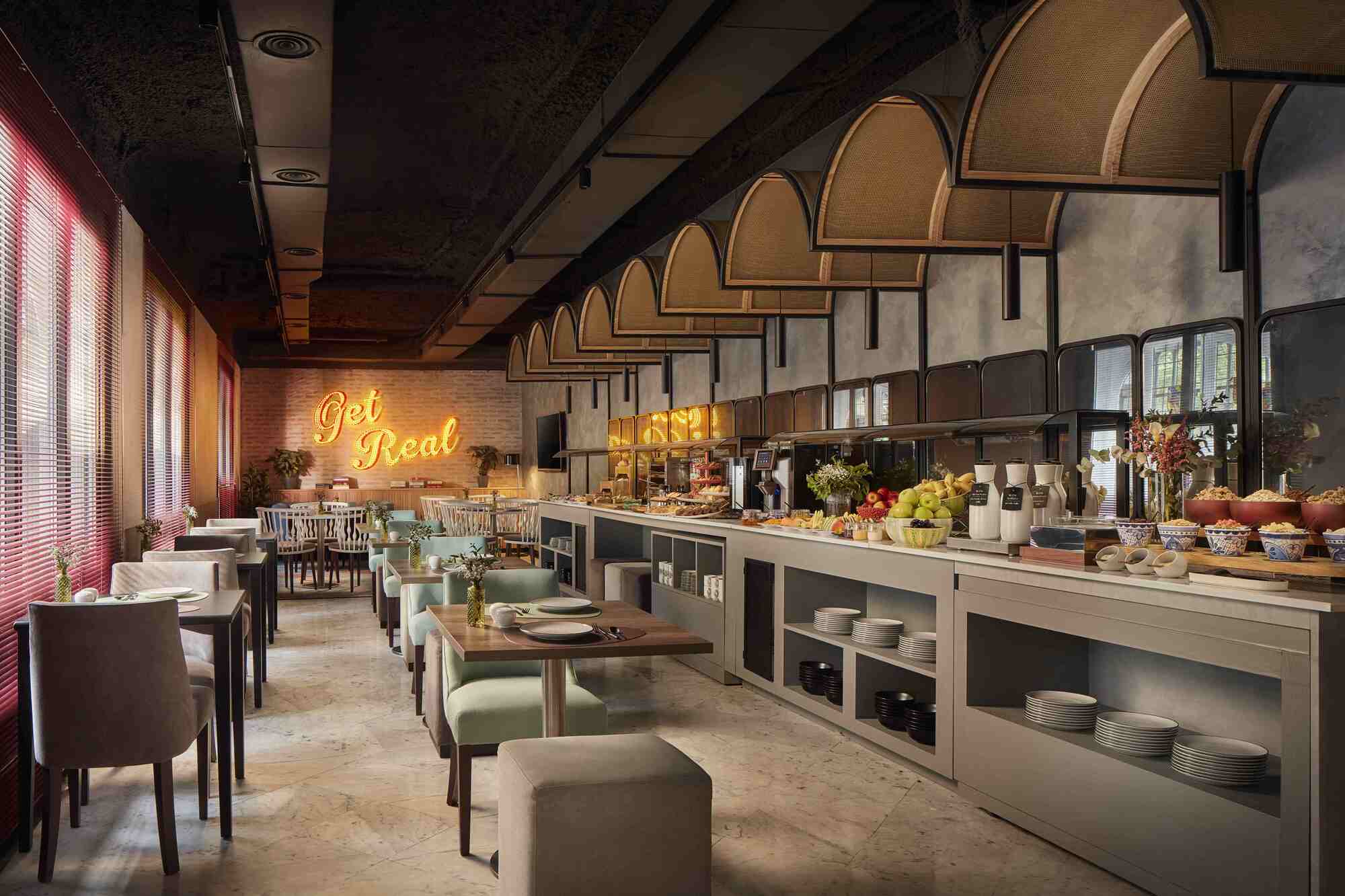 No interior, cada detalhe é inspirado na cidade. À entrada, os hóspedes são recebidos por uma escultura de um gato amarelo e as paredes do colorido lobby são realçadas por placas exibindo expressões tipicamente de Madrileñas. Já a escadaria homenageia o traje tradicional da região com uma série de elaborados xailes de Manila pintados à mão nas paredes Como parte desta transformação, o hotel ampliou também a área de pequeno-almoço de forma a oferecer aos hóspedes uma experiência gastronómica de excelência. Os clientes que necessitarem de uma solução mais rápida de manhã, terão também disponível uma vasta seleção de cafés, pães, pastelaria e saladas no The Pantry.