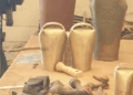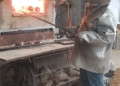 “O processo começa todo pela chapa de ferro. Nós cortamos a chapa de ferro, depois talhamos aqui na tesoura e vamos moldar com o martelo na bigorna, que é o que está a acontecer agora. Estamos a moldar o chocalho, neste caso está a fazer as orelhas do chocalho”, visualiza-nos o início do processo de produção de um chocalho Guilherme Maia, um dos proprietários da fábrica. Neste local, está um mestre, que faz o acerto sonoro dos chocalhos, mas já lá iremos; outra operária lida com o forno, colocando, virando ou tirando casulos de barro. Os vários processos de fabrico deste objeto considerado Património Cultural Imaterial são realizados na fábrica, cada canto para uma etapa. “A esta parte nós chamamos de fazer o corpo do chocalho, que é o que está aqui. Este é um modelo que é o «picadeira» e este que o meu pai está a fazer é o «reboleiro». O primeiro mais largo em cima e mais estreito em baixo e este é todo por igual, é mais direito. São os dois modelos que fabricamos atualmente”, acrescenta o responsável.