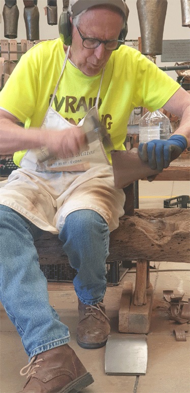 O chocalho tem orelhas, asa, céu e batente. É este o corpo do chocalho. Mas para o criar é necessário fundir ferro com cobre, estanho e zinco. “Depois, a partir daqui, o que é que nós fazemos? Vamos cortar o latão. O latão que tem uma percentagem de cobre, estanho e zinco. A maior percentagem é de cobre. Cortamos o latão, mas cada tamanho de chocalho tem o seu peso de latão. Nós pesamos o som”, sentencia Guilherme Maia.