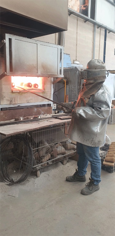 Tendo o ferro, forrado com o latão, na fábrica procede-se ao seu isolamento com papel (para não se sujar a peça) e depois procede-se ao seu embarramento (numa solução de barro com palha triturada – moinha, com uma última passagem pela fieira), para que as chocalhos sigam, após o casulo de barro seco, para a fundição no forno a gás a 1250 graus. O barro quer-se de Alcáçovas, “porque nós experimentámos barro de outras zonas do país. Não sei explicar, mas não resultou. Se calhar também não é por acaso que havia muitos chocalheiros antigamente em Alcáçovas”.