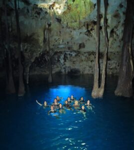 Começamos por uma excursão aos cenotes do Grupo Xcaret, piscinas naturais de água doce formadas por um dos maiores sistemas de rios subterrâneos do mundo. Da palavra maia “dzonot”, que significa buraco com água, ou poço, os cenotes eram considerados sagrados pela civilização maia e um canal de comunicação com os deuses. E há de tudo, desde os cenotes formados no interior de cavernas, aos semiabertos ou a céu aberto, bem como os que são totalmente fechados.