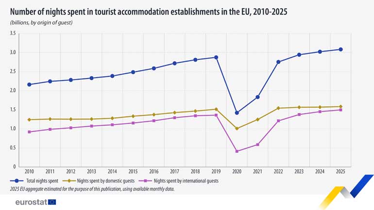 Em 2025, o número de dormidas em estabelecimentos de alojamento turístico na União Europeia (UE) atingiu 3,08 mil milhões, superando o ano anterior em 61,5 milhões, ou 2%, segundo os dados divulgados hoje pelo Eurostat.
