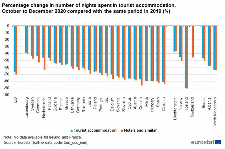 As maiores quebras verificaram-se em Espanha (-99%) com menos 61.573.000 passageiros, Alemanha (-59,1 milhões e -97%), França (-44,2 milhões e -97%), Itália (-42,6 milhões e -98%), Países Baixos (-20,9 milhões e -96%), Portugal (-15 milhões e – 97%), Irlanda (-10,3 milhões, -98%), Áustria (-9,2 milhões e -98%) e Dinamarca (-9,1 milhões, -97%).