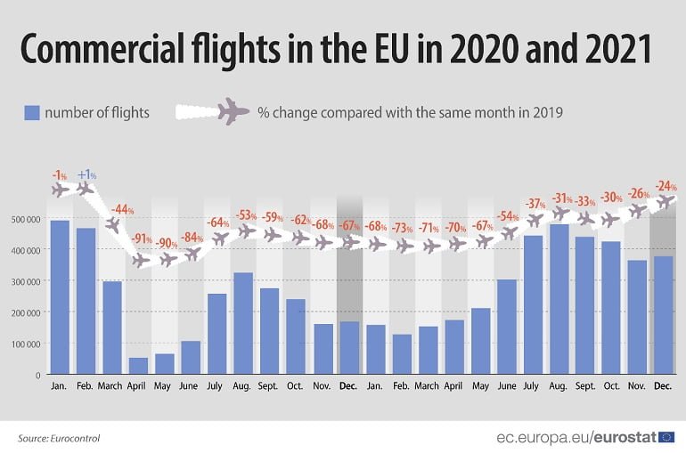 A indústria da aviação tem estado a recuperar gradualmente ao longo de 2021. Embora os primeiros meses do ano não indicassem sinais de recuperação: janeiro (-68% face a igual mês de 2019), fevereiro (-73%), março (-71%) e abril (-70%), a situação começou a alterar-se em maio (-67%), junho (-54%) e agosto (-31%). Setembro teve uma pequena queda (-33%) mas outubro (-30%), novembro (-26%) e dezembro (-24%) assistiu à maior aproximação de sempre relativamente aos números pré-pandémicos.