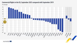 Olhando para os últimos dados de setembro, 12 países excederam os números de voos face a 2019. Chipre (+24,1%), Polónia (+22,4%) e Grécia (+21,4%) superaram 2019 e tiveram um aumento expressivo no número de voos comerciais. Por oposição, Letónia (-29,8%), Suécia (-27,3%) e Finlândia (-23,9%) ainda estão longe dos números de 2019.