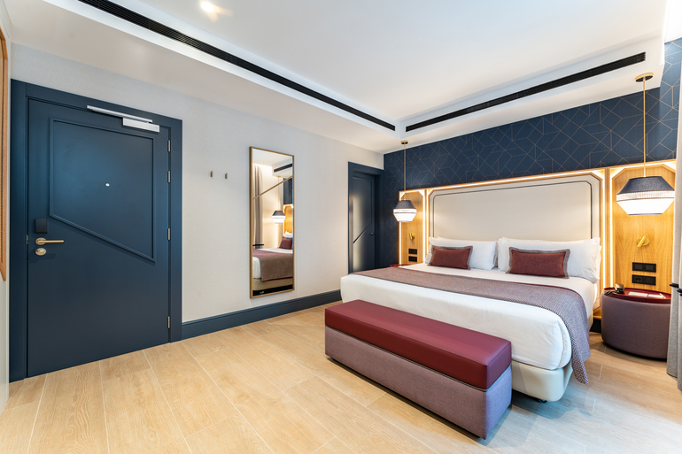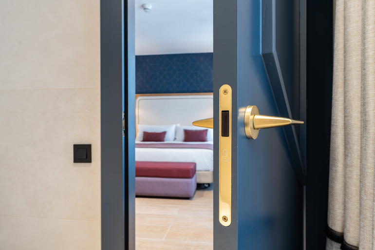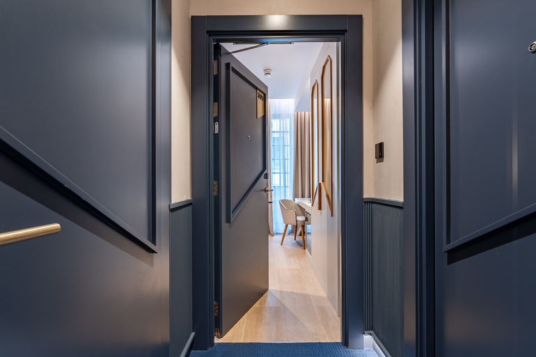 A atenção especial dedicada à segurança e conforto dos utilizadores do hotel reflete-se na seleção técnica rigorosa dos elementos implementados, com especial destaque para o Portaro® EI30 AC44dB, que alia eficazmente a proteção corta-fogo ao isolamento acústico até 44 decibéis, promovendo o bem-estar e a privacidade dos hóspedes. Esta solução foi complementada pelo Portaro® EI60, com resistência até 60 minutos, também aplicado na versão Inverse, que permite alinhar as portas com os painéis ou guarnições, criando superfícies retilíneas e contínuas.