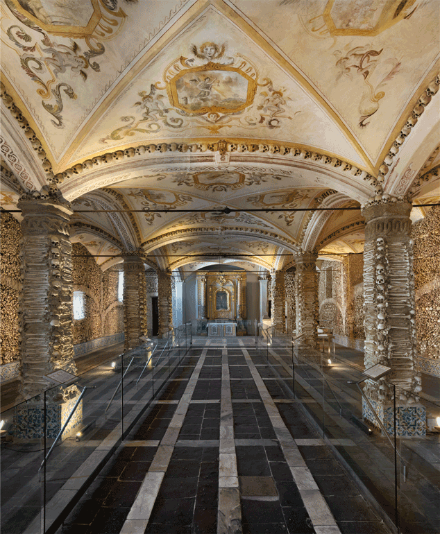 A Capela dos Ossos, indissociável do famoso título “Nós ossos que aqui estamos pelos vossos esperamos” anuncia, logo à entrada, a sua missão enquanto espaço de reflexão sobre a condição humana e de aceitação da morte como inseparável da vida.