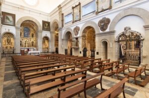 No interior, a excelência de todo o conjunto artístico e devocional remete em primeiro lugar para a espiritualidade jesuíta. O elevado valor iconográfico e simbólico da pintura mural quinhentista, com particular destaque para toda a composição do teto da sacristia-nova enquadrando episódios da vida de Santo Inácio de Loiola, articula-se com o enorme efeito dos embrechados de mármore, altares de talha barroca povoados de cartelas figurativas, alegorias, emblemas e inscrições, ou no original púlpito em calcário de lioz e bronze, a sublinhar a vocação daqueles padres para a pregação.