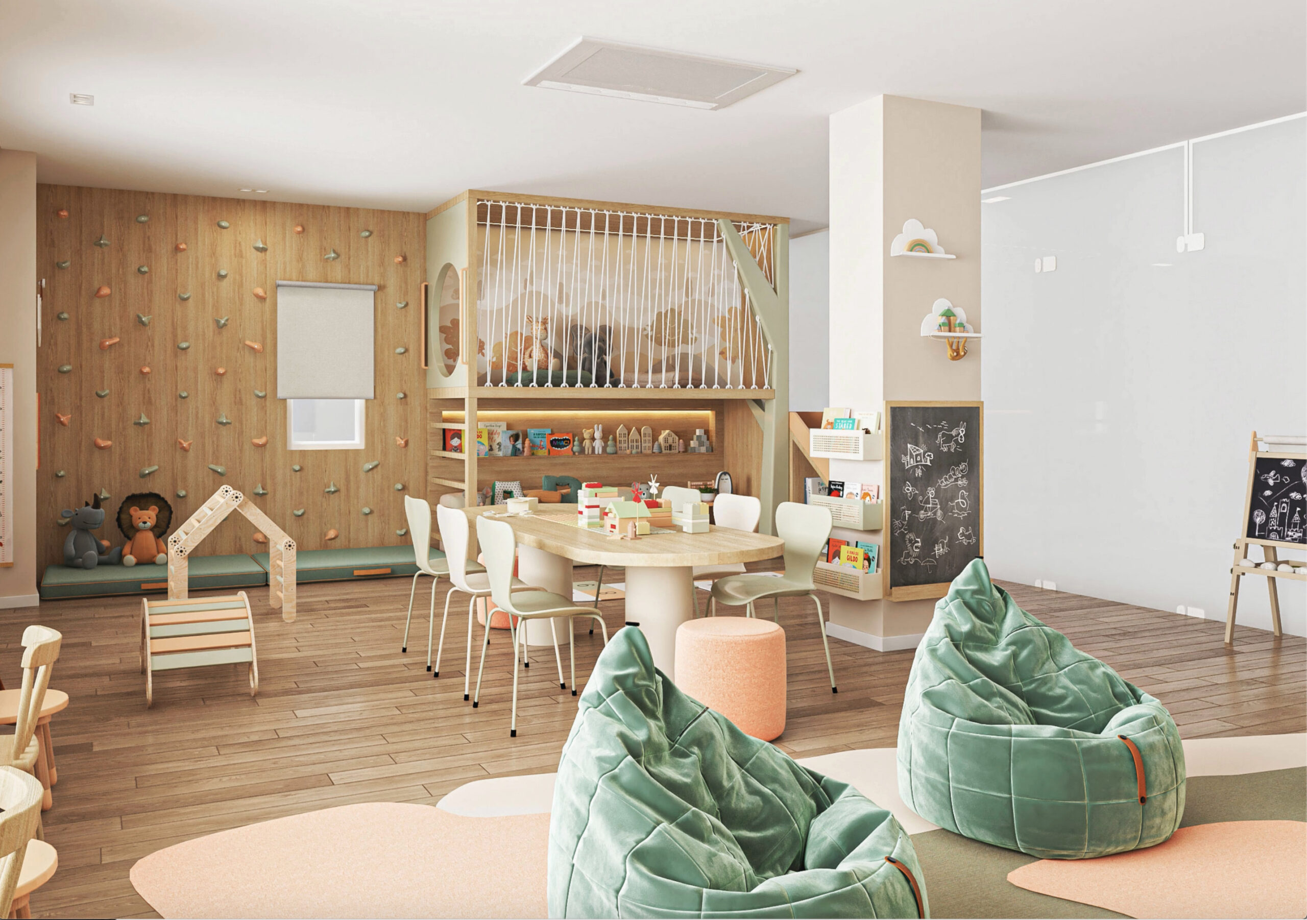 Com capacidade para 20 pessoas, este espaço foi concebido propositadamente a pensar na experiência sensorial e social das crianças, pelo que inclui desde circuitos de atividades físicas, incluindo até uma parede de escalada, uma zona de desenho que convida os mais pequenos a dar asas à imaginação, a uma área com TV, ideal para momentos de lazer e até mesmo, diversos jogos, materiais de construção e áreas sensoriais.