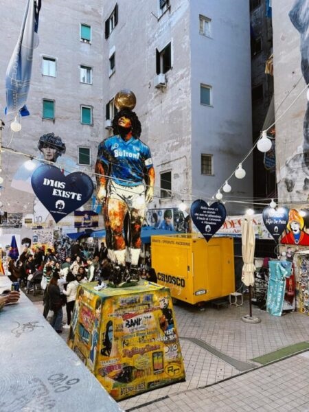 Como pudemos ver, esta cidade é rica na sua história e na sua cultura, e merece várias horas e vários passos dedicados a ser conhecida, começando exatamente pelo “Quartieri Spagnoli” – aqui pode perder-se pelas ruas mais autênticas de Nápoles, sentir a dinâmica dos que aqui vivem e trabalham, e sentir a claustrofobia de luzes, vozes e até tributos. É nesta zona que pode visitar o famoso mural dedicado a Diego Maradona, jogador de futebol que atuou pelo clube da cidade nos finais dos anos 80, e que depois da sua morte dá o nome ao estádio. Conhecido por “D10S” entre os napolitanos, este é um nome fortemente e orgulhosamente respeitado. Existe até uma loja local onde, alegadamente, pode observar um fio de cabelo de Maradona.
