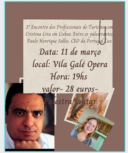 Será sexta-feira (11) às 19hs no Vila Galé Opera, em Lisboa, o 5º Encontro dos Profissionais do turismo com Cristina Lira. Evento de networking, que acontece no Brasil . Em formato palestra jantar e por adesão custa por pessoa 28 euros com bebidas inclusas. Terá como palestrante, o CEO da Portugal Lux, Paulo Henrique Salles Cunha que falará sobre a retomada do turismo, sua passagem pela TAP até chegar a Portugal Lux. O evento conta com apoio da Nethospitality , El Corte Inglês de Lisboa, Terra Tour Turismo, Promartur Viagens e turismo, SERHS Natal Grand hotel & resort, Assist Card Brasil. Os interessados em participar podem contactar esta colaboradora pelo instagram @cristinaliraturismo ou pelo whatsapp (+55 84994316084)