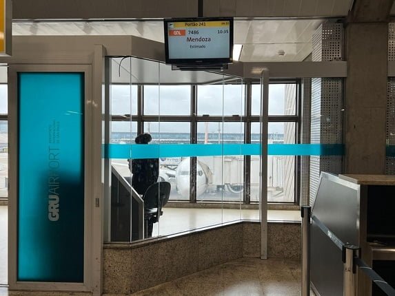 O portão de embarque, em Guarulhos (GRU), sinaliza o voo G3 7486, de retomada da GOL a Mendoza (MDZ), na Argentina (Foto: GOL Divulgação)