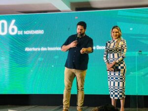 Vítor Bauab, presidente BBG Brasil, e a primeira-dama da cidade de Altamira, Apoliane Gomes, durante evento de lançamento do projeto nesta quinta-feira (04), no Hotel Vale do Xingu.