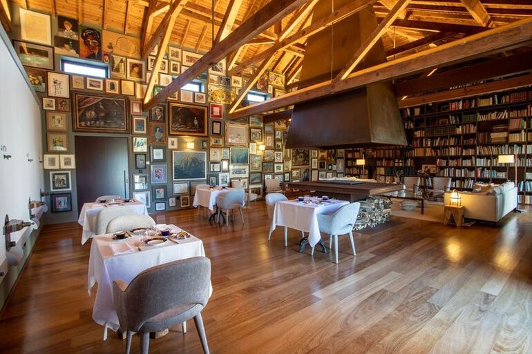 É também na sala da biblioteca que são servidos os pequenos almoços e brunches mais frescos e com produtos da própria quinta, incluindo os já famosos ovos biológicos das galinhas Pedres da Quinta da Abelheira, o pão de massa mãe da região preparado no forno caseiro, com compotas caseiras e fruta variada dos pomares da quinta. Sempre servidos num serviço de Limoges e talheres de prata.