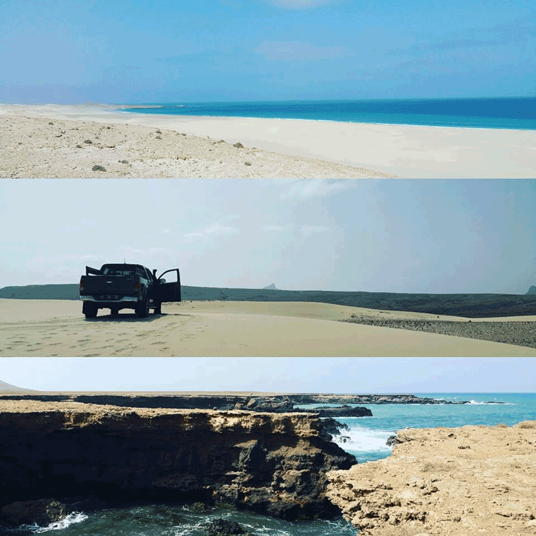 Instalados no exterior de uma pick-up – um dos veículos mais utilizados na Boa Vista – e equipados para aguentar o sol quente e os caminhos rochosos e irregulares que nos aguardavam, passamos primeiro por Morro de Areia, tendo como destino final o Deserto de Viana, com direito a uma paragem obrigatória na Praia da Varandinha. Situada no sudoeste da ilha esta é, sem dúvida, uma praia paradisíaca, entrecortada por rochedos que vão criando recantos menores para uma maior privacidade. Aqui pudemos conhecer a “famosa” gruta natural – Bracona – com vista para o mar onde pousámos mochilas para aquele que foi o primeiro de vários mergulhos nestas águas transparentes.