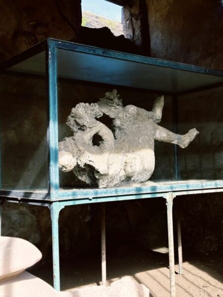 Antes de mais, (e com uma pontada de desilusão) destruímos um dos fascínios que tornava Pompeia tão interessante – os corpos conservados pelas cinzas da erupção. Na realidade, não são corpos reais, mas sim moldes de gessos de alta resolução feitos a partir dos espaços vazios deixados pela decomposição dos corpos. Os arqueólogos foram sim capazes de recriar posições e gestos das vítimas da erupção nos seus momentos finais.