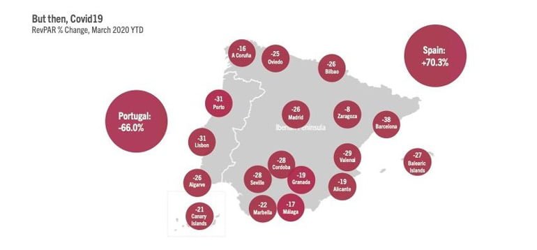 Os dados do ano até fevereiro de 2020 mostram, por outro lado, que o retorno dos hotéis de Espanha e Portugal era comparável ao de 2019. Portugal teve uma diminuição mínima de 1,1% no RevPar, enquanto que a diminuição de 4,4% de Espanha foi impulsionada por Barcelona (-17%), enquanto que todos os restantes mercados analisados pela STR registaram crescimento.