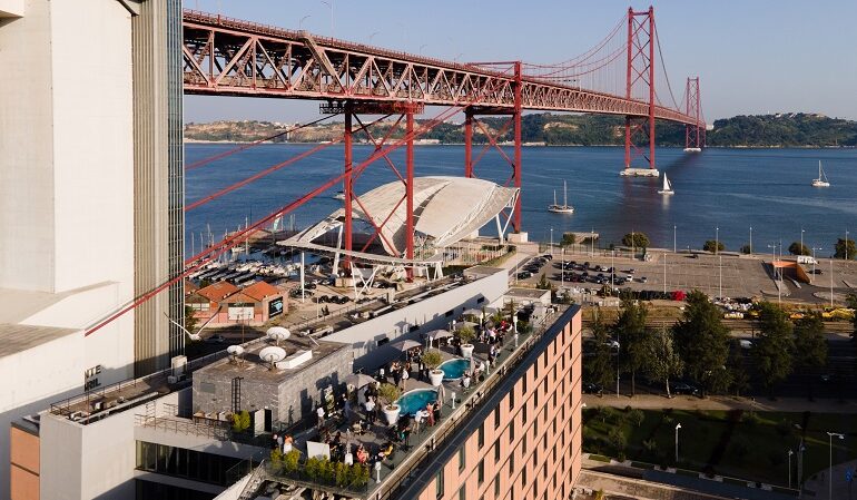 O rooftop do hotel Vila Galé Ópera, em Alcântara, reabriu ao público com uma imagem renovada e novas funcionalidades, mantendo como destaque a vista direta para o Rio Tejo e sobre a cidade de Lisboa.
