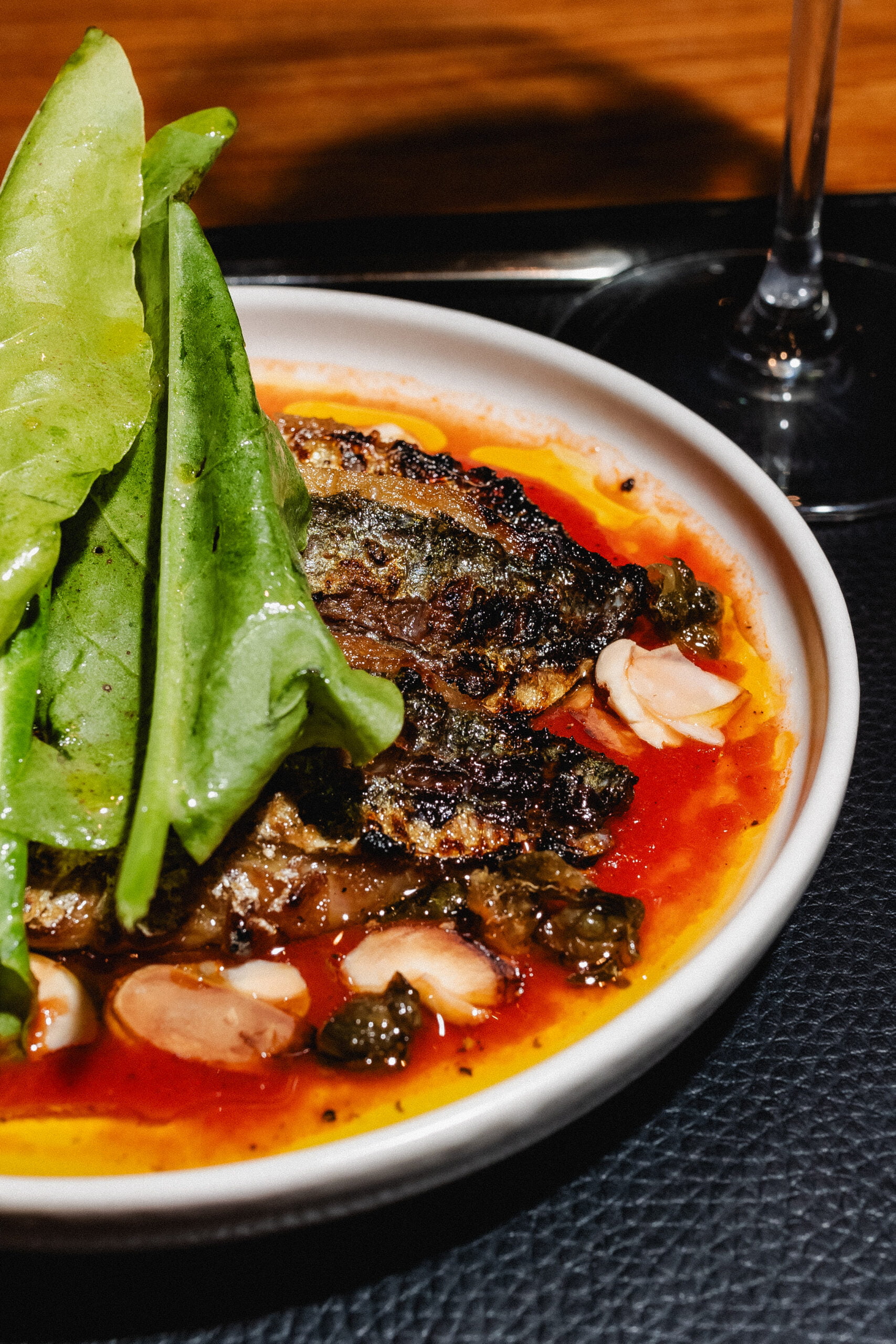 Para os fãs de peixe, a entrada Carapau é o ideal: peixe grelhado no carvão, somente de um lado, molho de tomate italiano (homemade) temperado com pimenta do reino, alcaparra frita, amêndoa e azedinha (17€).