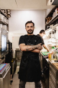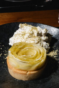 Não deixe de ter espaço para o Tartar de Carne de novilho picado na ponta da faca, cebolinho, furikake (condimento japonês) e picles de mostarda e molho inglês. Vem sobre um pão brioche produzido pela padaria vizinha, a Marquise. (14€).